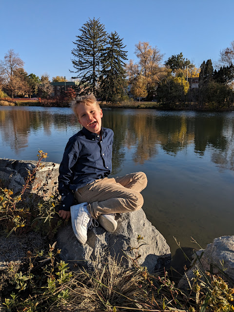 We recently had family photos taken. While the photographer was working with an older brother, B wanted me to take his picture by the lake. Several reminders were given about being careful near the water, which were listened to and he didn't fall in the lake. However, no one mentioned the big hole of mud right next to the rock he chose to sit on. Naturally, he stepped right into the mud. We didn't get documentation of the complete mess (too preoccupied at the time trying to clean up) but the pic below is after I'd wiped him down (using the only thing we had - Chipotle napkins from the car) and gotten one completely brown shoe somewhat white again.
